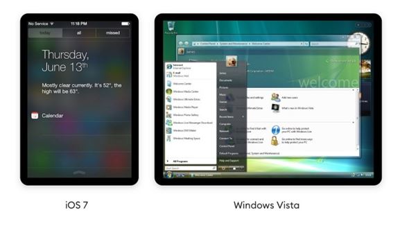 이에 애플은 2013년, ios 6에서 7로 넘어가면서 ‘플랫 디자인’이라는 새로운 디자인 양식을 선보입니다. 왼쪽이 스큐어모피즘, 오른쪽이 플랫디자인에 해당합니다.