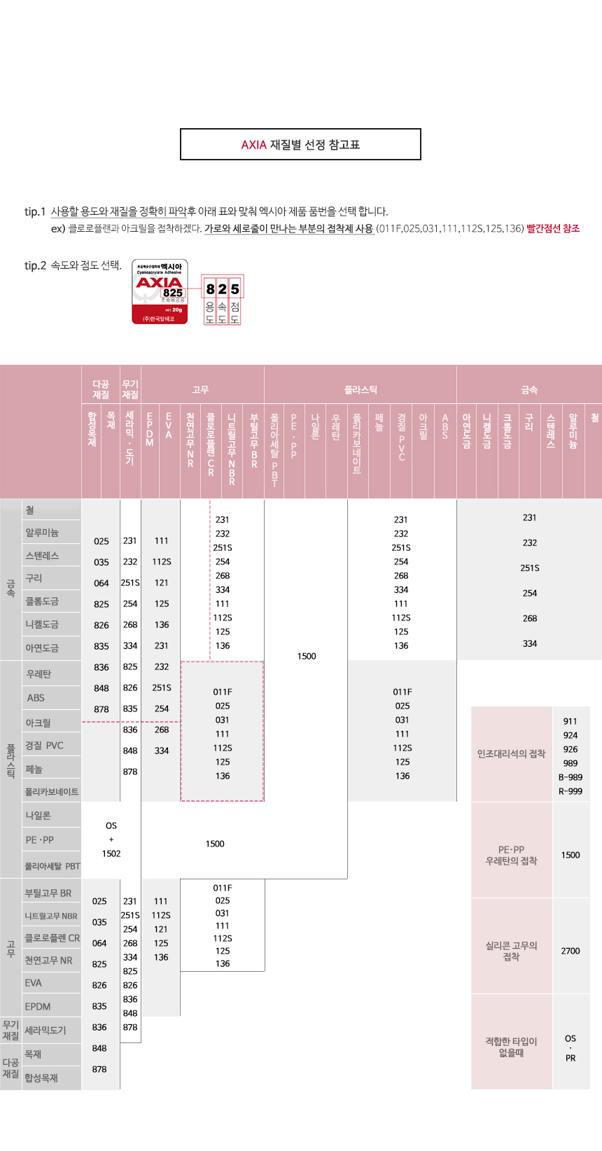 첨부된 표에서 가로와 세로에 각각 재질이 적혀있는데, 만나는 지점의 제품이 잘 붙는 종류의 순간접착제 번호입니다.