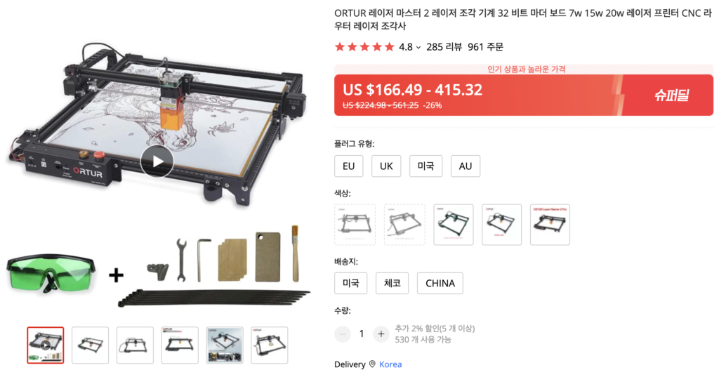 오랜 숙원이었던 레이저 장비를 만들어볼까도 생각했는데, 현 상황상 그리고 자작이 돈이 더 들기 때문에 구매를 하기로 마음먹고 드디어 구매를 했습니다.