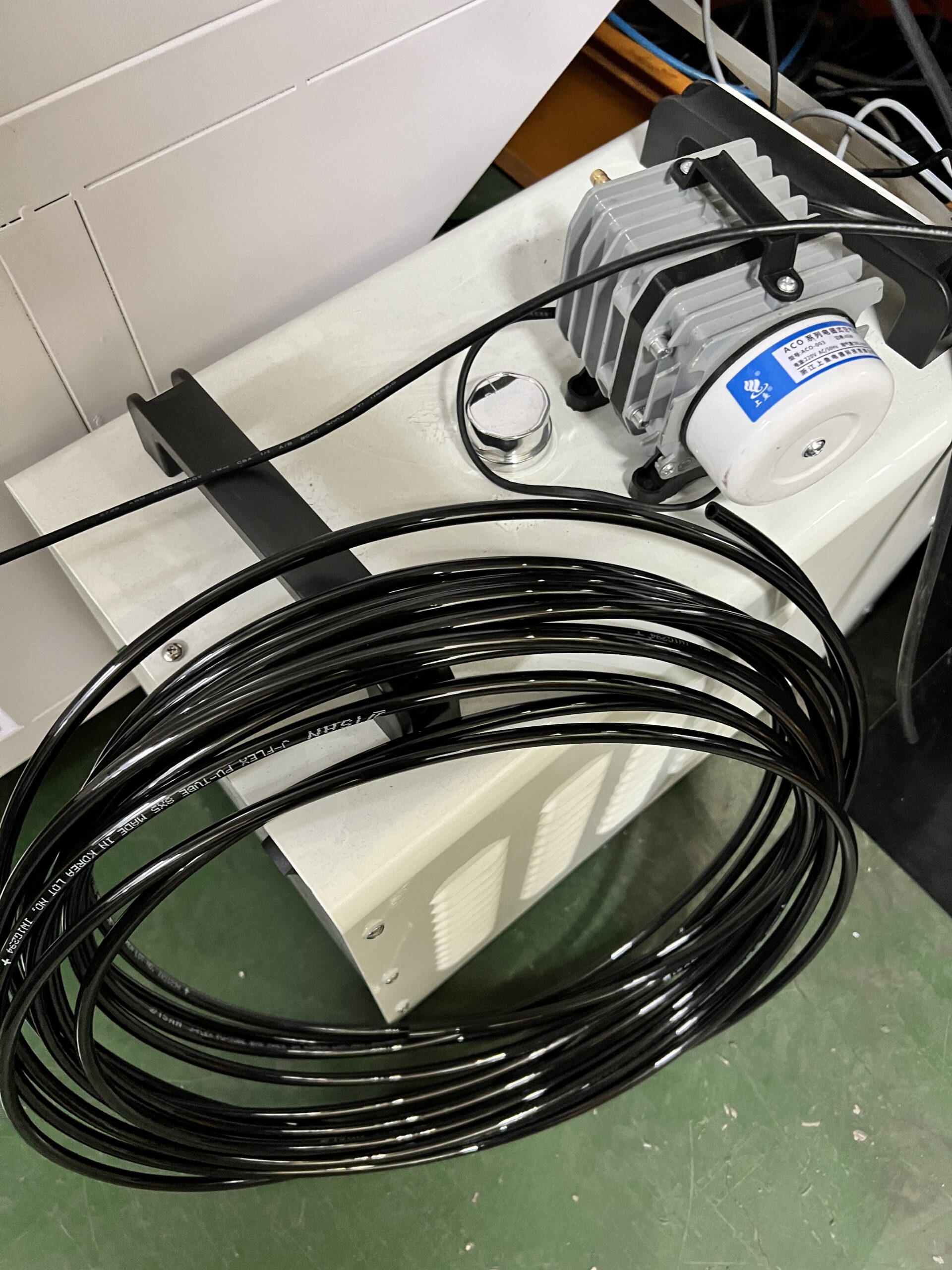 저 조그마한 부품이 에어콤푸레샤입니다. 저의 경우는 레이저가 설치된 공장 내에 산업용 콤퓨레샤가 있기 때문에 외부에서 라인을 끌어오는 작업을 진행해서 힘들게 연결하였습니다. 콤프가 없으신분들은 탱크가 있는 조금 큰 콤푸레샤 구매하시거나 있다면 연결해주시면 좋습니다.
