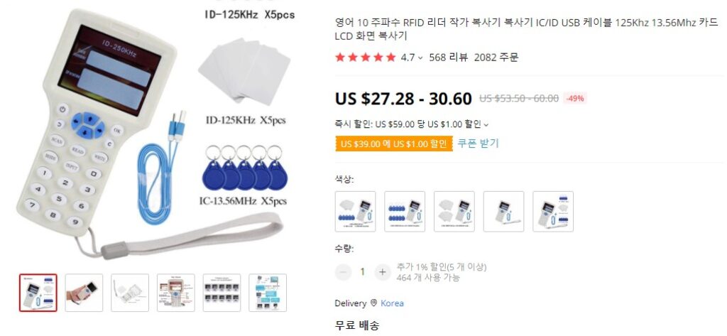 보통 도어락 카드키는 RFID라는 주파수를 이용해서 통신을 하며, 카드키 또한 고유한 주파수를 가지고 있습니다. 복사 기기에서 지원하는 주파수가 있기 때문에, 모든 제품이 되는 것은 아닙니다. 또한 복제를 할 키나 스티커 제품이 반복 라이팅이 되야 한다고 합니다. 국내에서 판매되는 rf스티커나 카드는 안되는 경우가 많다고 하는데 판매법상에 제한이 있나 싶습니다. 복사기를 구매하실때 해외에서 같이 구매하는게 좋다고 합니다.