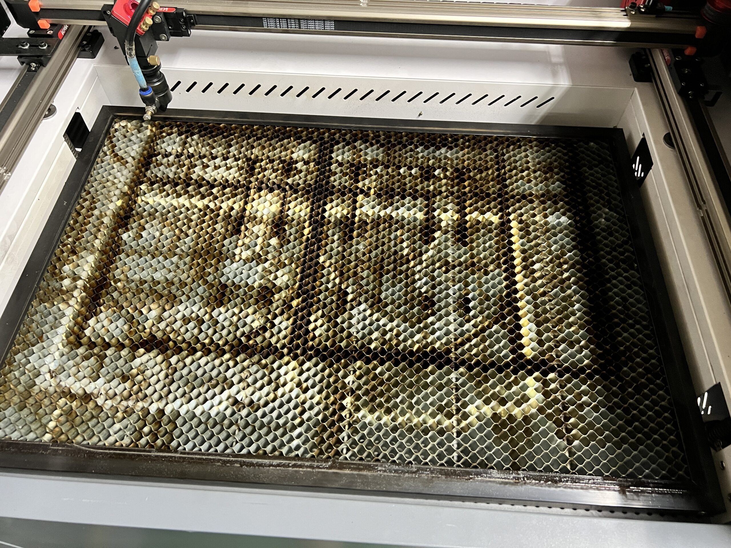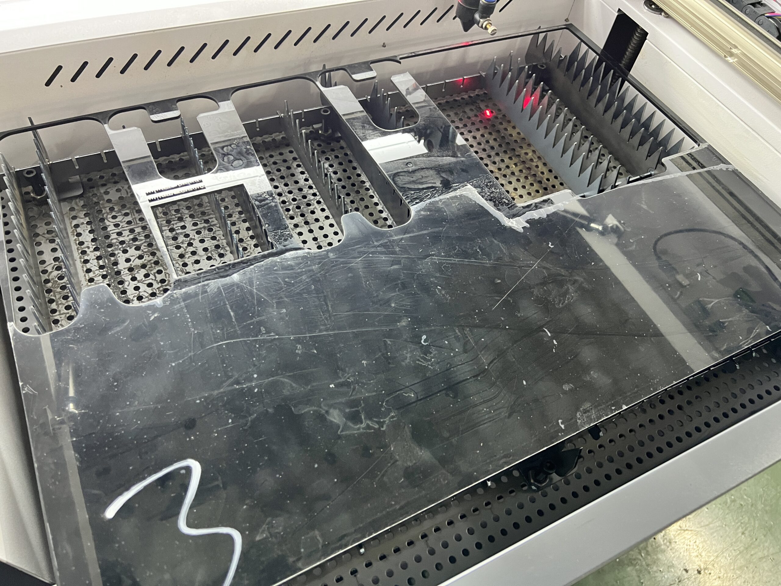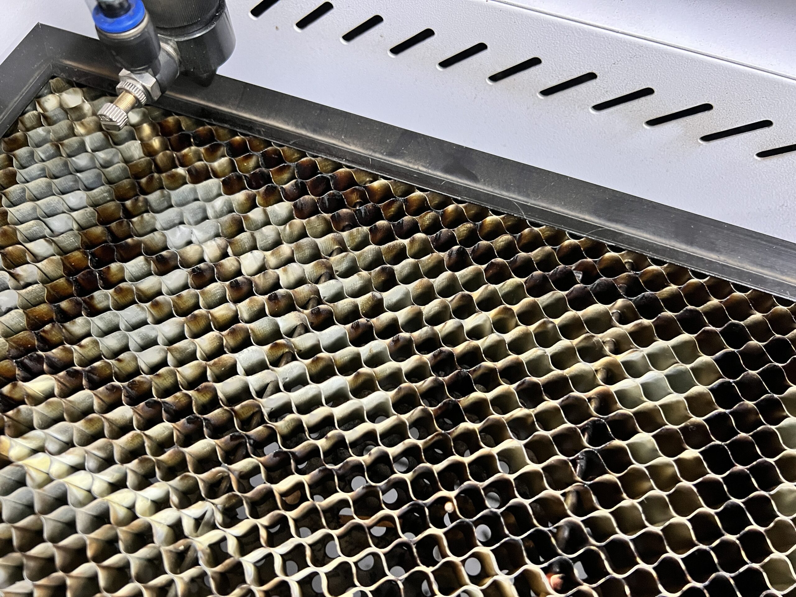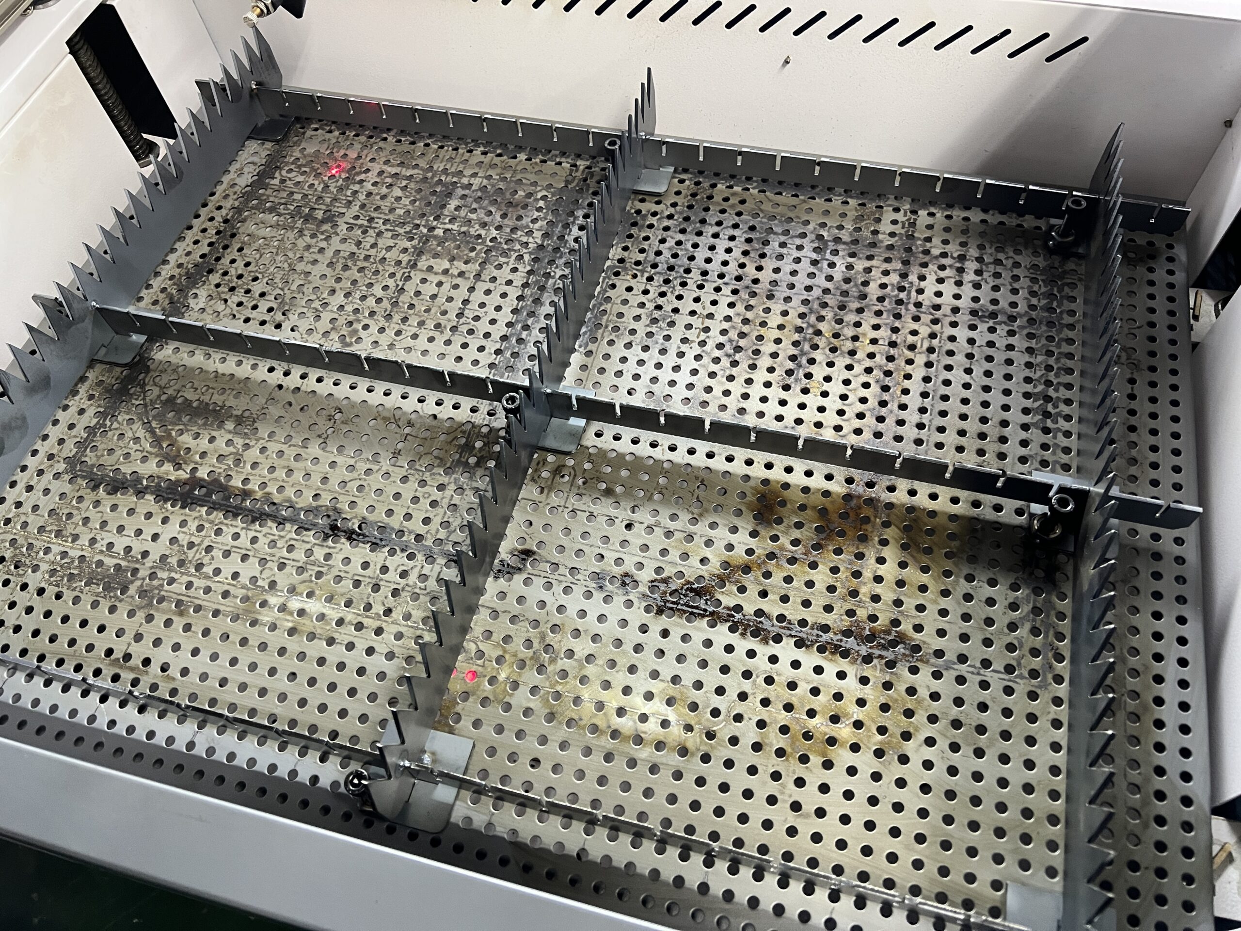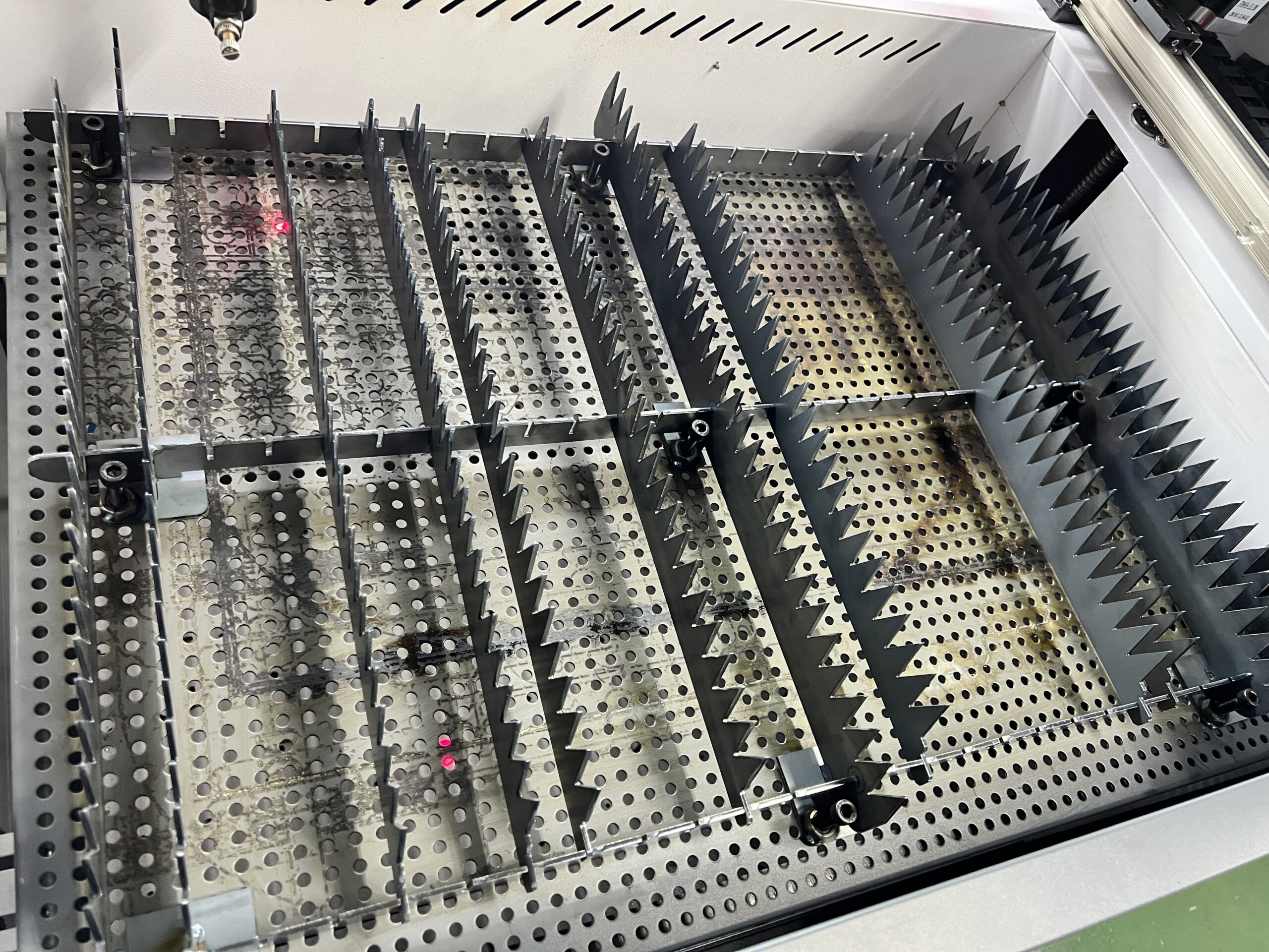 베드마다 장단점이 있습니다. 허니콤 베드의 경우 안정적으로 소재를 받칠 수 있고, 작은 부품을 따더라도 촘촘히 박혀있는 그릴 덕분에 절단 후 제품을 줍기가 편합니다. 반대로 단점은 촘촘함 덕분에 뒤쪽으로 배기가 잘 되지 않고, 대부분의 경우, 풀 사이즈 소재를 절단할 때 허니콤 베드의 테두리 위에 소재를 절단하게 됩니다.