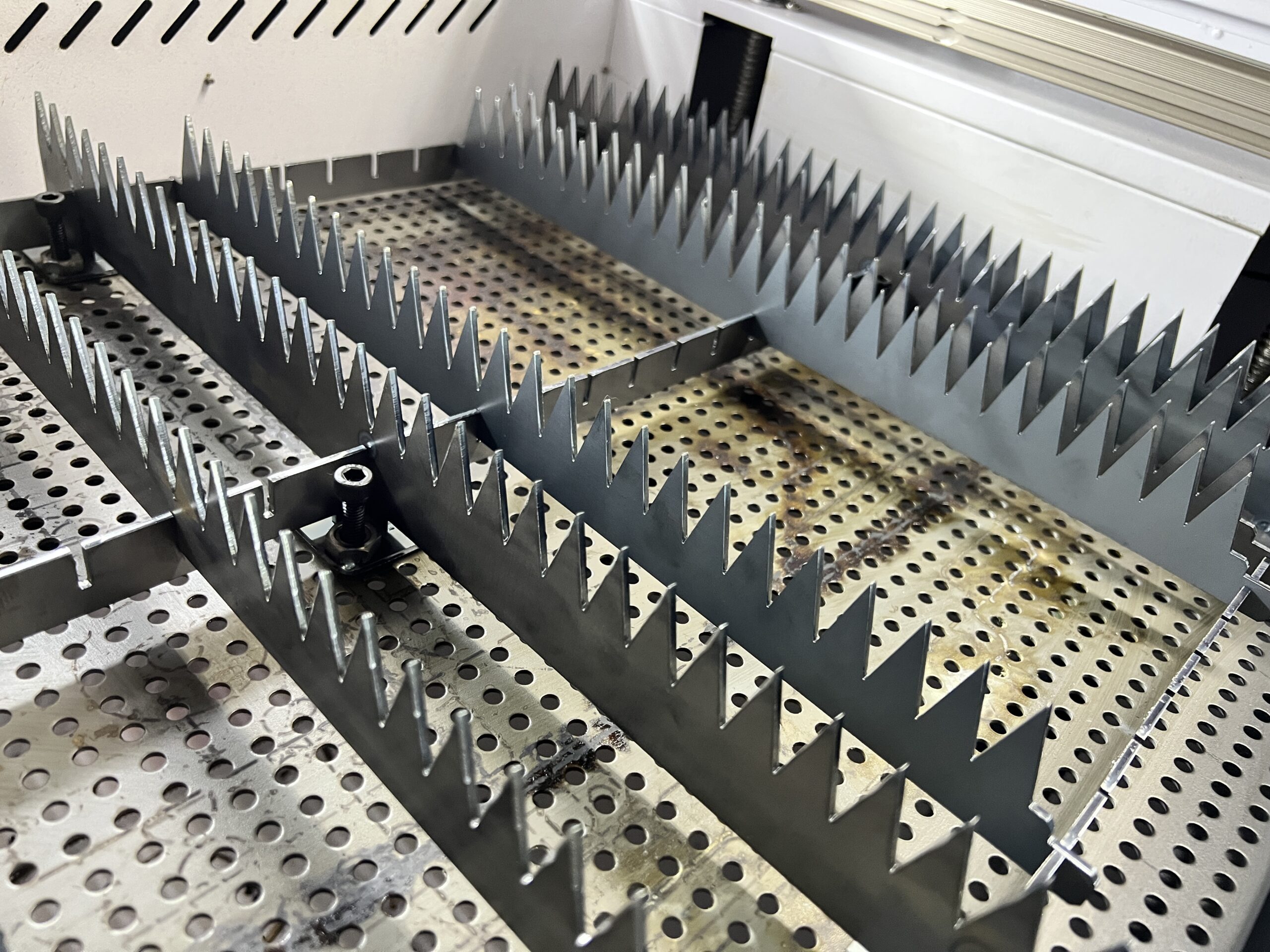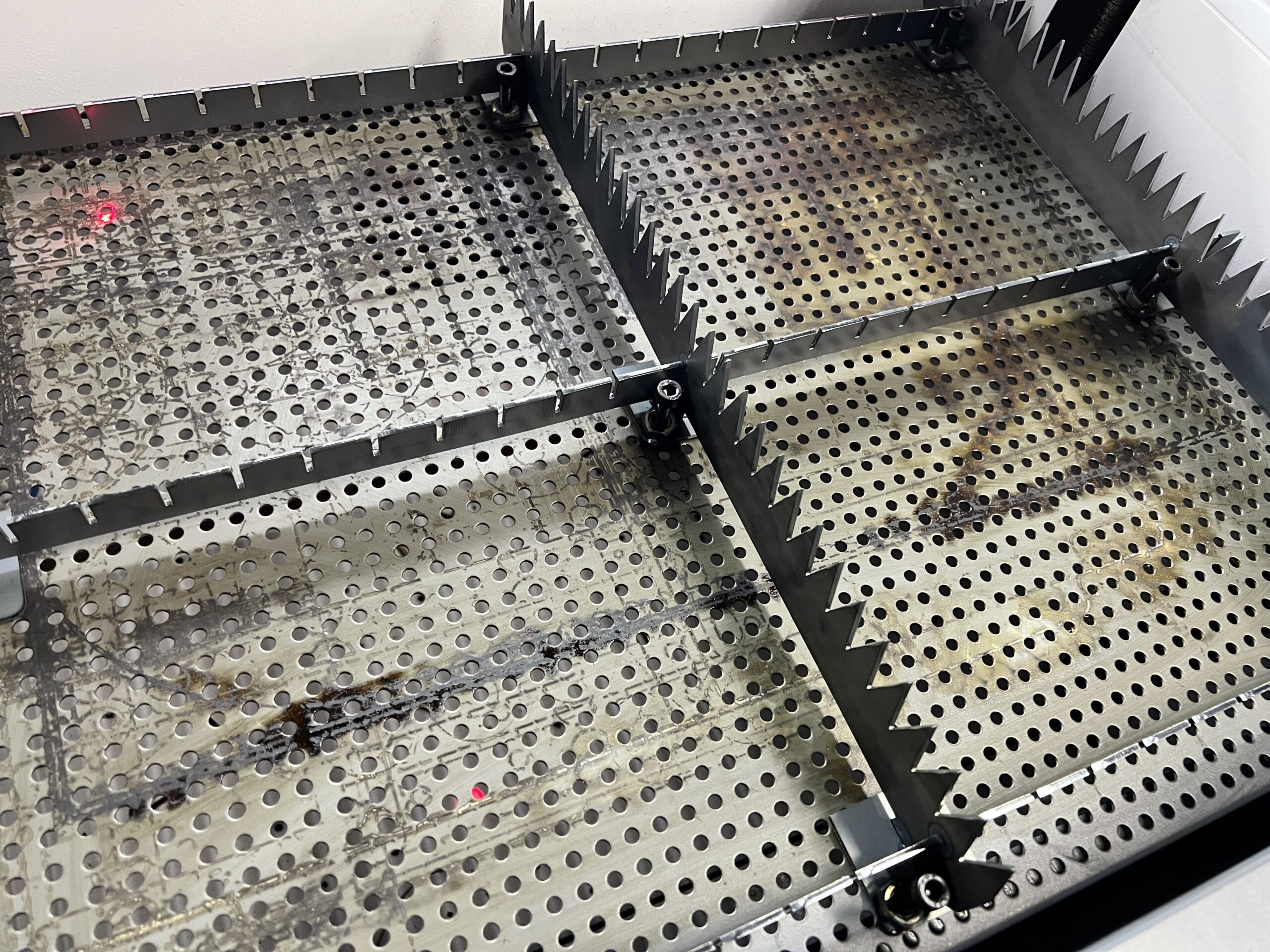 제작한 칼날 베드에서 고려한 부분은 수평을 맞출 수 있는 조절좌(볼트)를 추가한 점입니다. 레이저 세팅 시 가장 중요한게 초점 거리를 잡는 것인데 헤드와 베드의 수평이 중요합니다.